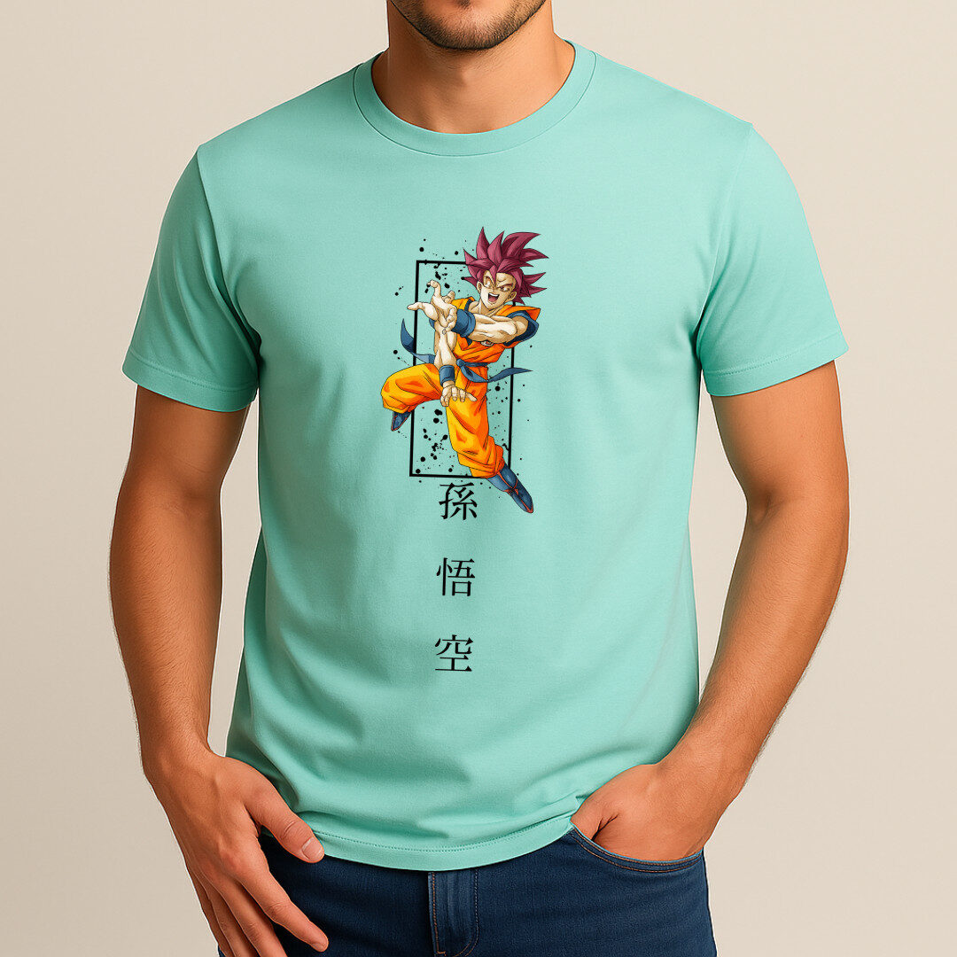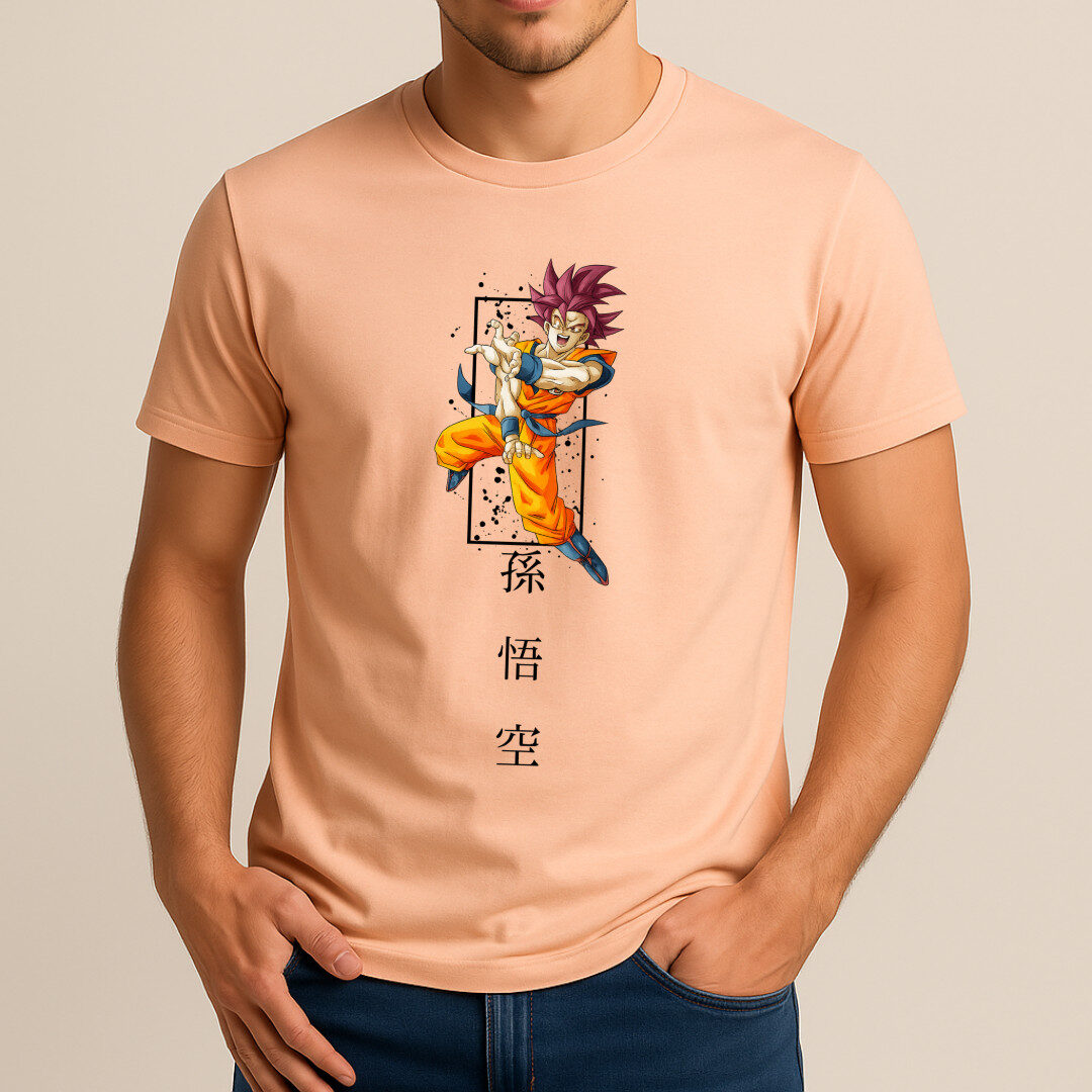 This stylish peach/mint-toned T-shirt celebrates the legendary Son Goku from Dragon Ball Z, featuring a dynamic, high-quality print of him mid-action, surrounded by striking design accents and vertical Japanese kanji spelling out his name. The bold artwork and vibrant colors make it a standout piece for any anime fan’s wardrobe.