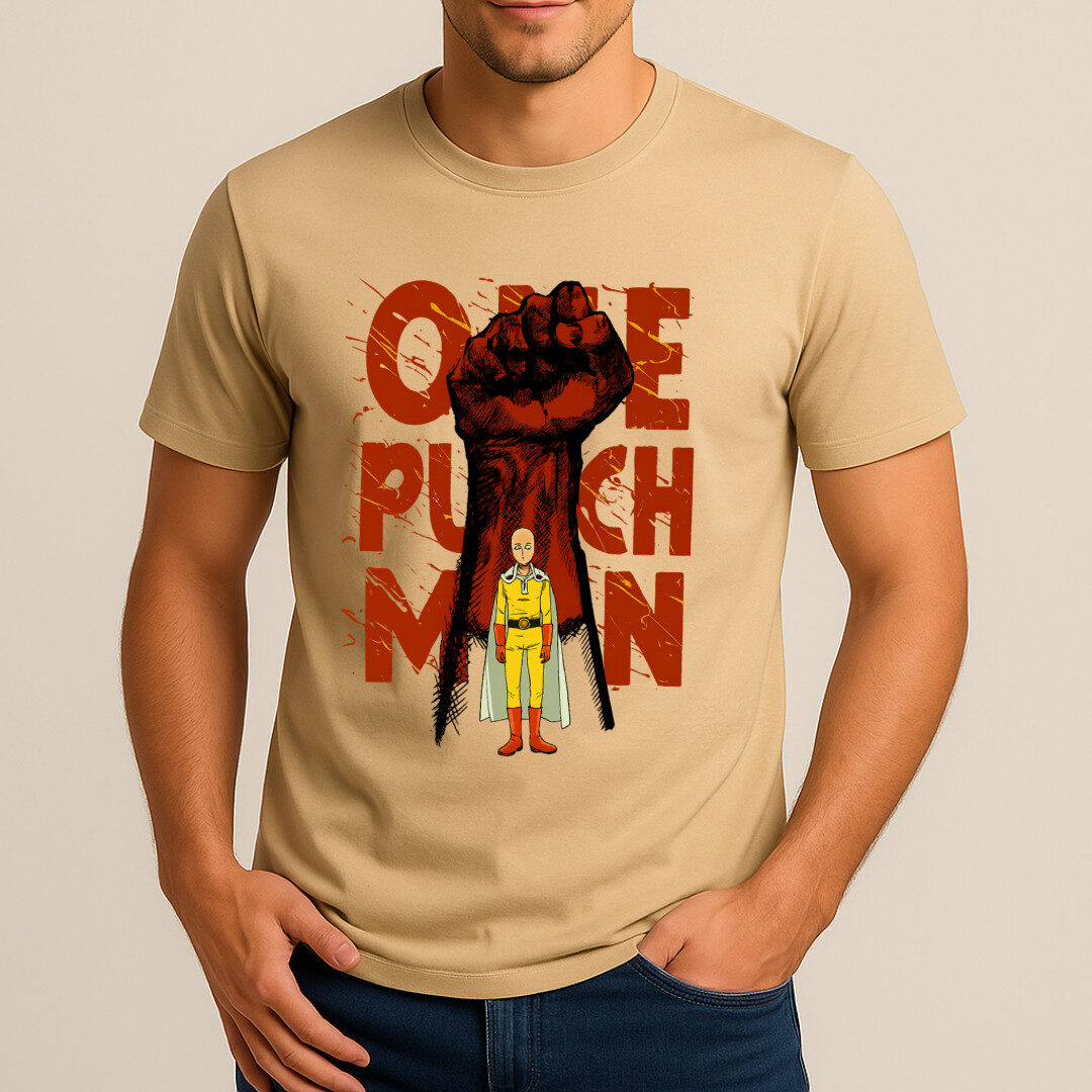 This beige One Punch Man T-shirt is a must-have for any fan of the legendary hero Saitama. The front design showcases Saitama in his iconic yellow jumpsuit and white cape, standing calmly in his typical unbothered pose. Behind him looms a massive, bold clenched fist — a striking symbol of his unmatched power — with the words “ONE PUNCH MAN” in distressed red typography filling the background. The combination of vivid illustration and gritty lettering captures the essence of the anime perfectly: raw strength, effortless victory, and a touch of humor.